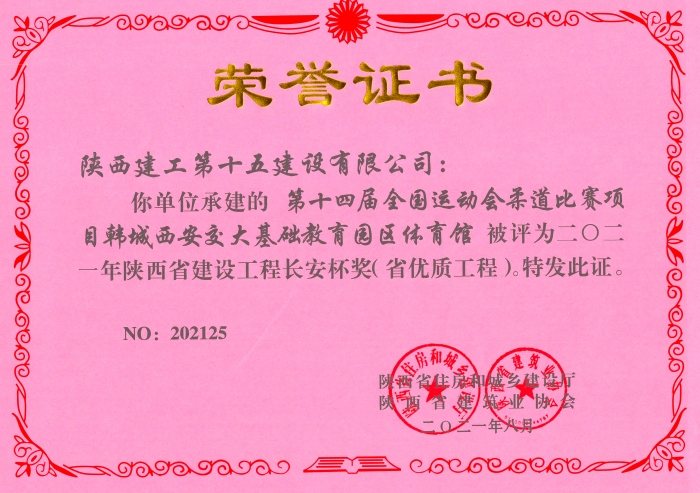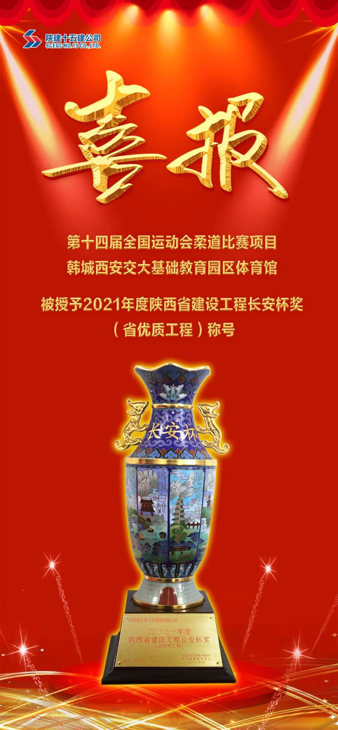 公司承建的第十四屆全國運動會柔道比賽項目韓城西安交大基礎教育園區體育館被評為二零二一年陜西省建設工程長安杯獎。