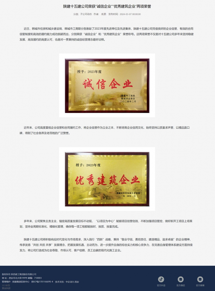 【陜西建工】陜建十五建公司榮獲“誠信企業”“優秀建筑企業”兩項榮譽